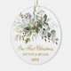 Modern Elegant Watercolor Greenery Couple Vår första julprydnad innehåller vackra botaniska grönska, eukalyptus löv, hullbär och andra vackra blad. Guld-skript. Foto bakåt.