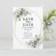 Modern Elegant Watercolor Botanical Grey Save Datakortet omfattar eukalyptus löv, grönt botaniskt löv, dammiga blå löv och andra vackra botaniska grejer. Guld Geometric Ram. Foto bakåt.