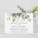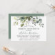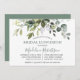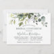 Modern Elegant Watercolor Botanical Grey Möhippa Luncheon-inbjudan omfattar eukalyptus löv, grönt botaniskt löv, dammiga blå löv och andra vackra botaniska grejer. Trendig Calligraphy Script. Skicka tillbaka Grönten.