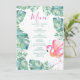 Det här rosa flamingo- och monstera handflatan löv-menykortet för middagsvisning i ställe är perfekt för ett tropiskt tema för födelsedag och studentfester. Konstruktionen har mina ursprungliga botaniska gröntar med en tropisk fågel. Typografin är inställd i ett handskript och sans serif-teckensnitt i rosa och grönt. Se den tropiska matchningssviten på www.zazzle.com/dotellabelle