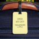 En bagagetagg med en bra vattenfärgsdesign. Koala bär mamma och baby. Baby rider på mammas rygg. Stå vid träd gren. En hibiscus blombukett nedanför. Bakgrund till Banana gult.