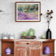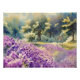 A vibrant, expressive watercolor painting captures a lush lavender field in full bloom. The foreground is a sea of purple and violet flowers, leading the eye to a sun-dappled forest in the background. The impressionistic style and soft washes of color evoke a serene, pastoral landscape, perfect for art lovers, home decor, and digital collections.