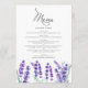 Lägg till en blommigt för elegant med accent för händelsens tabellutrymning med det här lavender-menykortet. Den har vattenfärgillustrationer av lavender-blommor. Anpassa genom att lägga till namn och menyinformation. De här menykorten för lavender blommigt är perfekt för vår bröllop. möhippor, babyduschar, födelsedagar och liknande party.