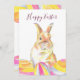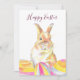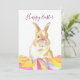Önska dina vänner och familj i glad påsk med det här söt regnbågskortet med en kanin omgiven av ägg på kortets framsida. Baksidan av kortet innehåller påskägg och ett personligt meddelande. Ursprungligen målad med vattenfärger på papper vattenfärg.