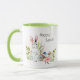Påsk helgdag mugg med en vattenfärgad illustration av en vit Påskhare med vibrerande rosa öron som krymper nära basket av färgstarka Påskägg med vattenfärg omgivna av rosa och gul ros och helgdag grönenergi. Det fet skriptet "Glad påsk" bredvid illustrationen. Ytterligare tillgängliga stilar och storlekar.