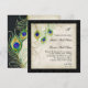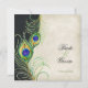 "Bröllopsinbjudan till Watercolor Peacock Feather Black Damask Inbjudan." Elegantens handmålade vattenfärgsverk av en pålfjäder skapades av den internationellt licensierade konstnären och designern Audrey Jeanne Roberts. Svart bakgrund med parchment färg damask och snöre subtle mönster. Copyright.
