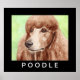Hund poster med vattenfärgsutskriften apricot pudel. Svart bakgrund gräns och namn med rasa tryckt på grund i vit text.