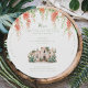 This elegant round wedding menu features a hand-painted watercolor illustration of a traditional Puglian masseria, paired with soft, cascading red florals for a romantic Italian-inspired feel. The design blends architectural detail with loose botanical elements, creating a beautifully balanced layout that feels both refined and organic.