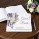 This elegant wedding guest book features a delicate watercolor design. The soft palette of purple and cream, combined with intricate floral elements, creates a timeless and romantic ambiance, perfect for capturing cherished memories on your special day. Ideal for adding a touch of sophistication and personalization to your wedding.