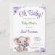A soft watercolor design featuring an adorable baby elephant holding delicate purple flowers, surrounded by lavender floral accents. The gentle pastel palette combines shades of purple, green, and soft gray, creating a calm and sweet look ideal for celebrating a baby shower. Elegant hand-lettered typography and floral corners add a whimsical, tender feel that works beautifully for a nature-inspired or storybook-style baby theme.