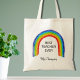 Lärarens Tote-väska är dekorerad med en barnlik regnbåge och ord Best Teacher nånsin. Anpassade enkelt med din favoritlärares namn.