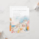 Modern, färgstark inbjudan till Medelhavsbröllop, med ett vackert vattenfärgslandskap och kusten i rosa, blått och orange på både framsidan och baksidan av inbjudan.