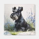 A soft watercolor-style illustration of a calm schnauzer seated among delicate blue wildflowers and meadow grasses, featuring gentle textures, a light neutral background, and a peaceful, natural atmosphere.