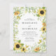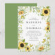 Elegant, bröllopsinbjudningar för blommigt med information om namn och bröllop omgiven av solblommor och lush grönt bladage. Solrosbaksidan går tillbaka till en solid grönt-bakgrund. Designad för att samordna med vår vattenfärgssolrosor och grön samling.