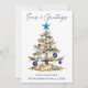Modern Minimalist Elegance Calligraphy Ink Pen Handwritten Script Seas & Greetings Coastal Holiday Card includes a Watercolor Christmas Tree make of beach ocean driftwood, seashells, sand dollars, nautical anchor ornament and topped with a starfish. Navy Blue Back.