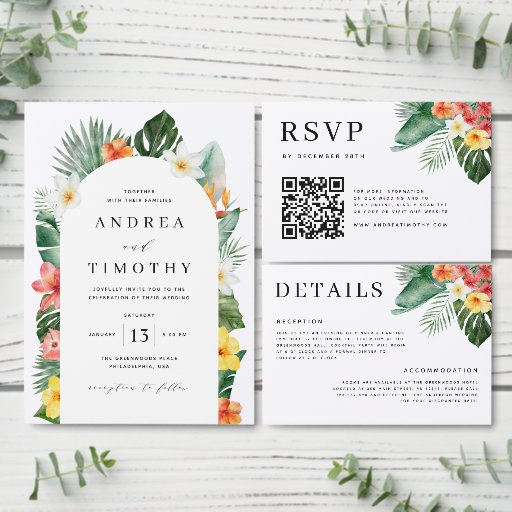 Ett elegant bröllop-OSA kort i tropiska sommartema med handmålade löv, hibiscus, handflatan löv och plumeria. Den innehåller en QR-kod som besökarna kan använda för att söka efter osa online.