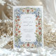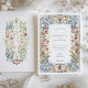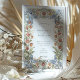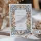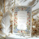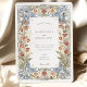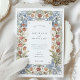 Den här romantiska bröllopsinbjudan har en handmålad Art nouveau-design med ett slående gräns av tulpaner i rikens jordtoner - terracotta, guldfärgad och varmt ro - riktad mot mjuka gröntar och himmel blues. Fintliga scrollsar och acanthus löv vävar genom ram, och omfattar det centrala textområdet med ett naturligt men strukturerat flöde. Den varma paletten i färg väcker en känsla av tidlös elegans, skapar denna design som är perfekt för bröllop eller firande som inspirerats av vintage. Blommigtarna är både detaljerade och uttryckliga och återges i en fantastisk vattenfärg i stil, vilket belyser det traditionella hantverkets charm. På motsatt sida, en botanisk vapensköld av prydnadsväxter presenter, en symmetrisk arrangemang av blommigtar och blad med mjuka pasteller och antika nyanser, med angivande av datum och initialer. Den här inbjudan är perfekt för par att tittar blanda bra, vintage elegans och ett romantiskt blommigt tema.