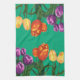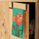 Delicately-outlined watercolor purple, orange, and pale yellow tulips pop against a gorgeous teal background. Tastefully colorful, this soft and absorbent towel adds brightness, contrast, and beautiful artwork to your kitchen setting.