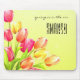 Vackra vattenfärgstulips bouquet-konst med ett namn monogram och ett kort-meddelande med ny solig bakgrund. Förbluffande realistisk vattenfärgsgrafik. Anpassa genom att ändra namn monogram och texten.