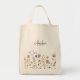 En snyggt livsmedel-tote med sin feminina boho vildblommor och personlig med ditt monogram initial och namn. Den har en gräns-rad med vildblommor i mjuka pastellnyanser av rosa, periwinkle blue, off-white och gult med ömtåliga stjälkar och grönt. En textmall finns med för att anpassa med ditt namn och ditt monogram som en första början.