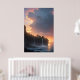 En digital målning visar ett serenlandskap med en dramatisk solnedgång. Himmel domineras av ett stort, flytande moln, som målas i skuggor av rosa, orange och lila. Nedan störtar en ansikte med kaskadande vattenfall ner i ett lugn hav. Vatten återspeglar solnedgångens varma huvar och skapar en lugn och eterisk atmosfär.