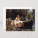 John William Waterhouse Dam i Shalott . Oljemålning på arbetsyta från 1888. Dam i Shalott är en vacker förRaphaelitmålning av en scen från Alfred Lord Tennysons dikt i samma namn. Målningen skildrar den dömda Dam av Shalott som seglar mot Camelot i en liten båt som är skrapad med en vacker rödtapeter som hon frodar när hon faller i kärlek med Lancelot. I båten sitter tre ljus och en crucifix från vilken flickan tittar bort. Själva dam är klädd i en ljusblå medeltida klänning som är broderad med guld. Hennes hår är ljusbål och hon håller båtens kedja medan den pressar bort från dockan till rasen och lilja dynor utanför. En underbar gåva till fläkt av John William Waterhouse, Pre-Raphaelites, Romantic English-tavla och Arthurian Legend.