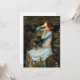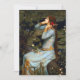 John William Waterhouse Ophelia-inbjudningar. Oljemålning på duk från 1894. Den engelske konstnären John Waterhouse hämtade ofta inspiration från litterära teman och Shakespeare var en av hans största inspirationskällor. Waterhouse ägnade flera tavlor åt Hamlets dödsdömda hjältinna Ophelia. Den här tidiga målningen visar flickan iförd en ljusblå klänning med guldbroderier och juvelbesatta armband. Ophelias hår är kastanjebrunt och prytt med mörkröda blommor. Hon sitter på kanten av en damm full av näckrosor med tusenskönor i knät. En fin present till fans av J.W. Waterhouse, Shakespeare, Ophelia, prerafaeliterna och engelsk romantisk konst.