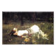 John William Waterhouse Ophelia skriver ut. Oljemålning på arbetsyta 1889. Den engelska målaren John Waterhouse målade många skildringar av Hamlets Ophelia under hela sin karriär. Denna version från 1889, hans tidigaste version, är kanske hans mest häpnadsväckande och dynamiska. Ophelia lägger i fält mellan vita och gult vilda blommor och högt gräs. Hon bär en enkel, men elegant vit klänning när hon springor handen genom sitt mörk bruna hår. En underbar gåva till fläkt av J.W. Waterhouse, Shakespeare, litterär målning, Pre-Raphaelites och engelsk Romantisk konst.