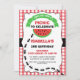 De här flickorna i picknic födelsedagsfest inbjudan har en bit vattenmelon, en banderoll för grönt, myggor, vit dekorativ ram och röd och vit plaid mönster. Utformningen innehåller även ett svart snedstreck. Jag ville skapa en picknick födelsedagsinbjudan till butiken för jag har ingen just nu. Samma inbjudan med fotografiet finns på butiken och på födelsedagskalendrar. Det är redo att vara personlig.