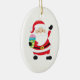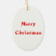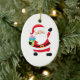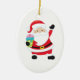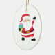 Denna ovala keramiska prydnadsföremål har en jollySanta som håller en omsluten gåva i ena handen och viftar den andra med glädje. Texten på baksidan lyder God jul.