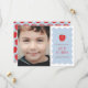 Fira ditt barns examen från förskolan med detta moderna och charmiga examensmeddelande. Framsidan av kortet visar en söt äppelillustration i halvtonefärg med en överlagring med texten "Klass (År)". Under illustrationen finns meddelandet "värd att vänta på" samt plats för ditt barns namn och deras skola. Texten och designen är placerad på en enfärgad blå bakgrund med en lekfull vit vågig ramkant. Detta meddelande innehåller också utrymme för ett stort kundfoto. Baksidan av kortet har ett koordinerande äppelmönster i halvtonefärg.