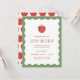 Skapad för att samordna med förskolexamensannonssamlingen "Wavy Apple", har denna moderna och charmiga examensinbjudan en söt halvtone-äppleillustration med ett "Årskull (År)"-meddelande överst. Under illustrationen står meddelandet "ljuset i våra ögon", följt av namnet på ditt barn och deras skola, samt detaljer om examensfesten. Texten och designen är placerad mot en solid vit bakgrund, med en lekfull, grön vågig ramkant. Baksidan av kortet har ett samordnande halvtone-äpplemönster.