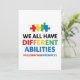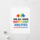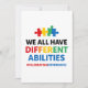 This powerful awareness design highlights inclusion and neurodiversity through bold typography and colorful puzzle elements. The phrase “We All Have Different Abilities” is presented with vibrant lettering to emphasize uniqueness, acceptance, and respect for all minds. A clean, modern layout delivers a positive and uplifting message that resonates with autism awareness, education, and inclusive communities. Designed to stand out while spreading empathy and understanding.