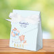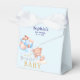 Lindo diseño de Cajita de Regalos para Baby Shower con Tematica de Oso "We can Bearly Wait baby" es un diseño lindo con tonos azules y la ilustracion de un oso con globos cafes. Se puede personalizar con tu nombre asi como la Fecha del Evento.
