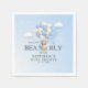 Diseño de Servilletas para Baby Shower con Lindo diseño para tu baby shower de niño con una Hermosa Tematica de Oso en acuarela volando en una canasta con globos azules y blancos y la frase"WE CAN BEARLY WAIT" con linda tipografia en color negro y un fondo azul con nubes blancas alrededor!.