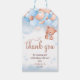 A sweet baby shower favor tag featuring an adorable teddy bear floating beneath soft blue and blush balloons with dreamy cloud accents. The warm “thank you” message and gentle watercolor style make it perfect for adding a polished finishing touch to favors, treat bags, and thank you gifts. A beautiful choice for a boy baby shower, teddy bear theme, or elegant pastel celebration.