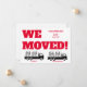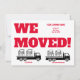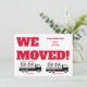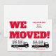 Clearly signal your business transition with this modern office relocation announcement. The design features two black flatbed moving trucks carrying detailed office desk and computer icons, paired with an impossible-to-miss bold red "WE MOVED!" headline. Set against a clean white background, this template offers a structured layout for your company name, new address, phone number, and website. It is a perfect choice for corporate offices, tech companies, or professional services that want a straightforward, industry-focused design to inform clients of their new location.