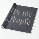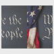 Words of the US Constitution "We the People" written on a chalkboard with a vintage American flag border