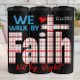 This powerful design declares "WE WALK BY Faith Not by Sight." "WE WALK BY" is in a vibrant blue, and "Faith" is boldly displayed with a red and white plaid pattern, extending into a cross. "Not by Sight" is in a flowing red script, creating a strong statement of Christian belief.