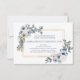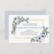 Det här vackra bröllopsinbjudningskortet har en guld-folie ram med ro i mjuk dammblått, grått och vitt med blek grönt botaniskt grenar. Det här kortet är till för dig till ge på webbplatsen adress och vilken ytterligare information som finns där, inklusive onlinens osa, anvisningar till platsen, presentregisterinformation och foton av alla viktiga händelser som leder fram till din mycket speciella dag! Omvänd sida är ett blek blått grått med en liten grupp blommor i mitten.