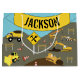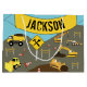 Cute illustration av en byggarbetsplats och ett lastbilar-tema. Bygget lastbil transport fordon omfattar lastbil, grävmaskiner, bakfots-, bulldozer-, kran- och frontlastare. Perfekten för lastbil, tunga maskinentusiaster för pojkar och flickor. Ideal Julklapp, födelsedagspresent, daghemsdeka, barnrumskonst, hemdekanter eller back to school. Anpassa namn och gör det till ditt eget.