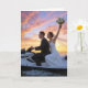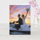 A bride and groom joyfully ride a jet ski under a stunning sunset sky.