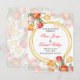 "Vibrant wedding invitation adorned with colorful tulips in shades of red, orange, yellow, and pink, beautifully framing the text within elegant golden circles. The combination of floral artistry and refined typography creates a joyful and romantic design, perfect for celebrating love in style."