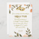 Bröllopsinbjudan visar färsk lax färg-blomma med grönt löv och ett par guldringar ovanpå kortet.