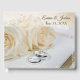 Wedding rings on the Holy Bible with white roses in an elegant frame.