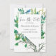A Nevada themed Save the Date card featuring a little bluebird and border of sagebrush with a white silhouette of the state shape. On the back is a very light shade of grey. Customize the text with your details.