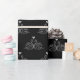 Contemporary white wedding swans design with a scribbled heart between them on a black background.