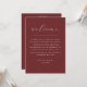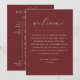 This double sided wedding card combines your full weekend schedule on the front with a welcome message on the back, keeping everything your guests need in one simple piece. The front side clearly lays out the wedding weekend timeline (from rehearsal dinner to ceremony, reception, and next day brunch) making it easy for guests to follow along. On the reverse side, a welcome message adds a personal touch. Perfect for including in welcome bags. The deep wine red background gives the design a rich, elegant look that works especially well for modern, classic, and formal weddings, as well as fall and winter celebrations. A clean and practical option for couples who want all key information in one place without extra inserts. Available as both a printed card and a digital download.