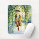 En musknapp som illustrerar bambu-vindar som hänger från en viftande vild träd med sjö bakgrund. En fredlig stillastående scen.
