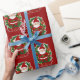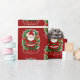 Farbenfroher Sticker im Cartoon-Stil. Roter Weihnachtsmann, umrahmt von Tannenzweigen, die mit Geschenken und Deko bestückt sind.